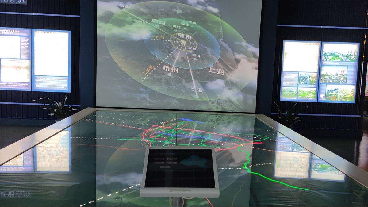 这款为常州规划馆定制的常州市综合交通规划沙盘联动演示系统,通过灯光和投影系统联动展示常州快速路系统、告诉公路环、水运、铁路、航运等交通规划信息,观众在查询机上点击想要了解的交通信息,投影机会将相关交通宣传片在墙面上投影播放,伴随电子沙盘灯光联动演示,直观形象地展示交通运输情况。
