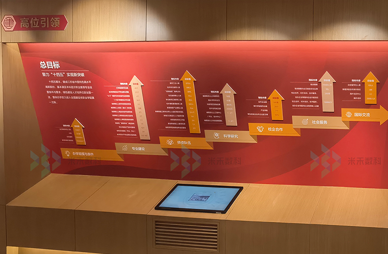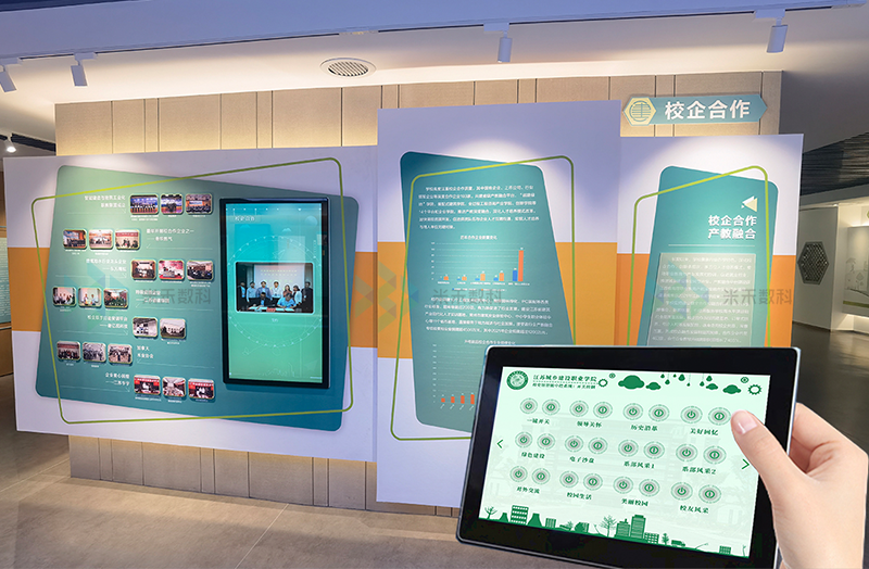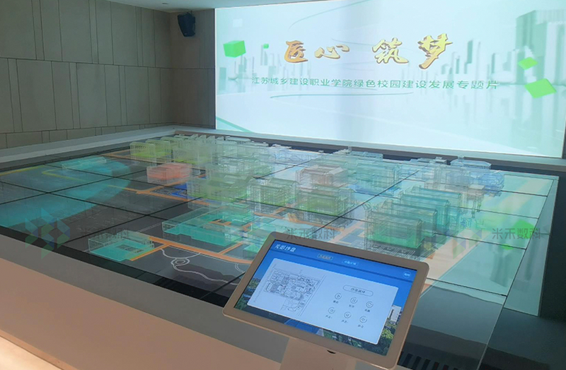 米禾数科深挖学校特色、整合学校资源、集合技术成果、围绕学校发展,突出表现江苏城乡建设学院的优势及发展的前瞻性,通过投影式数字沙盘、触控查询系统、大屏幕拼接、透明展示柜等多媒体展项,实现对学院信息的互动多媒体创意展示,变枯燥的数据堆砌为形象的感官体验,变晦涩的信息填塞为极具科技感的体验空间。米禾数科凭借专业的态度、创新的设计、丰富的经验,本次备受客户好评。