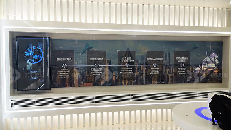 这款互动滑轨屏展示系统,在展示背景墙上总结了智能园区建设、客户能源管理、综合能源设备销售及安装、智慧物业系统建设以及能源交易咨询管理服务5项业务范围,通过滑轨屏对各项业务进行定点展示,播放更深入的图片、视频等介绍信息。