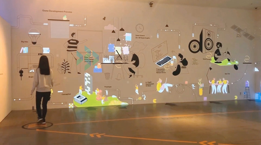 现代化展馆展厅设计中,多媒体互动技术的应用越发丰富多样,墙面互动投影凭借其沉浸式展览效果和魔法般交互体验倍受青睐。目前墙面互动投影系统的集成技术包括石墨烯、电容板、红外、电容等形式,在实际应用中我们一般选用雷达互动投影。