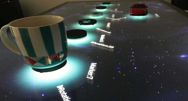背投物体识别桌是将投影机和红外识别设备安装在桌子底部,把识别码贴在展示产品背面,当观众将产品放于桌上时,会被红外设备识别,向系统发送相关指令,进而实现投影画面的变化。背投识别的优点是没有遮挡,可以同时识别很多个物体,缺点是红外光会受环境光线的影响,不适合太亮的环境。